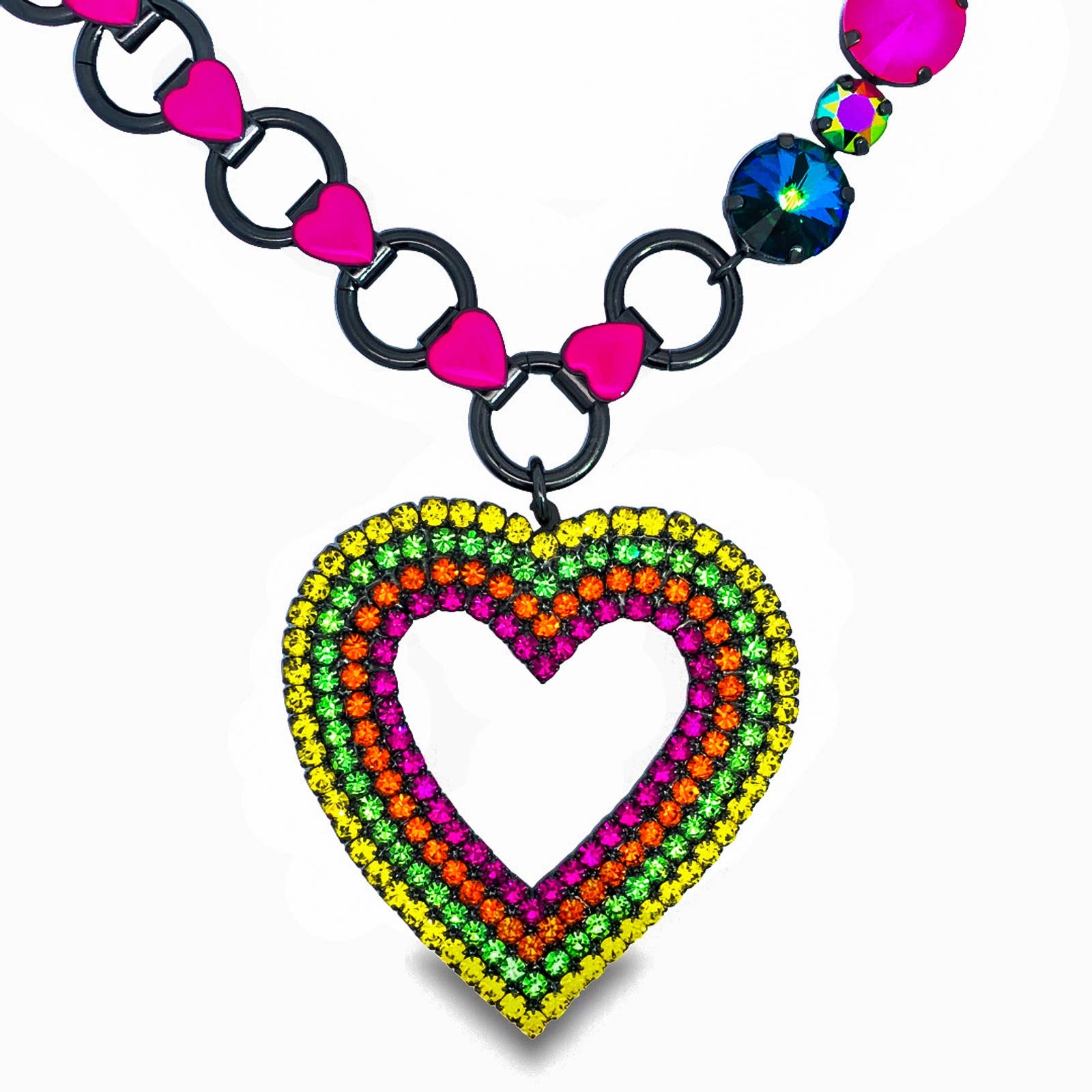 Show your love with this All the Hearts Necklace. Featuring gunmetal plating, high quality crystals, and hand painted enamel, this necklace is a stylish and unique option. Made in Canada and adjustable from 18" to 21", it's the perfect accessory to add a playful touch to any outfit.