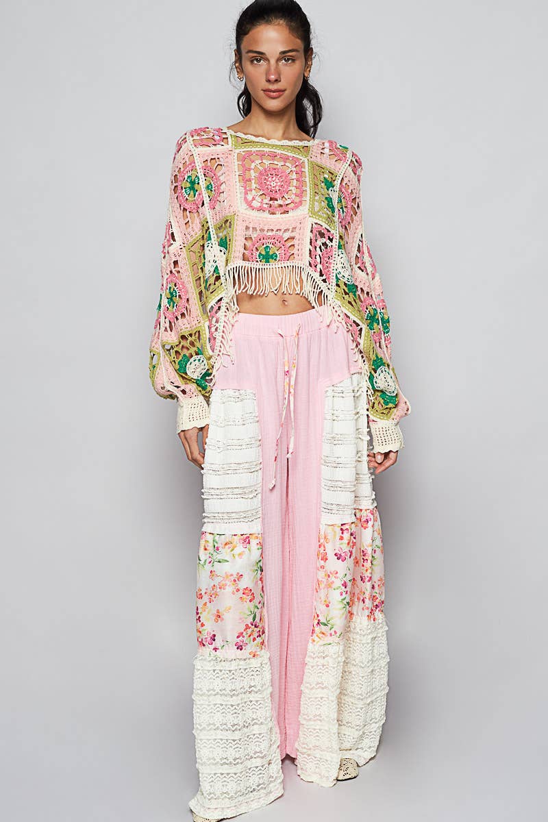 Designed in round neck long sleeve cropped fit top in crochet with various weave knit patterns and fringe detailing.