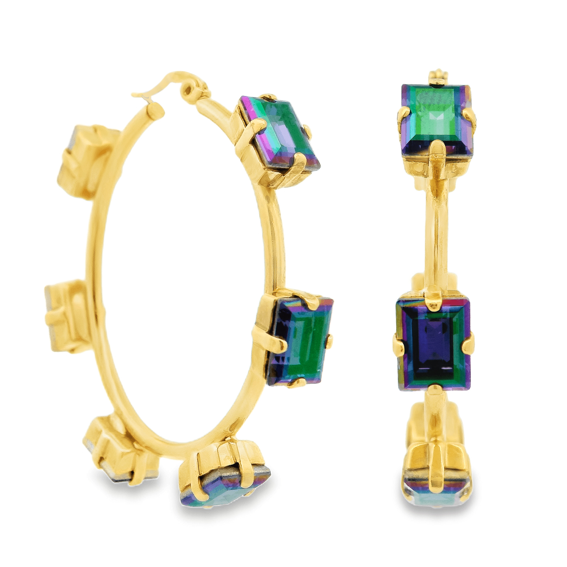 Introducing the Talia Hoops in Midnight Express! Antique gold plated hoops packaged with a brass base and high quality crystals. These 2" earrings add some glint and glimmer to your day.