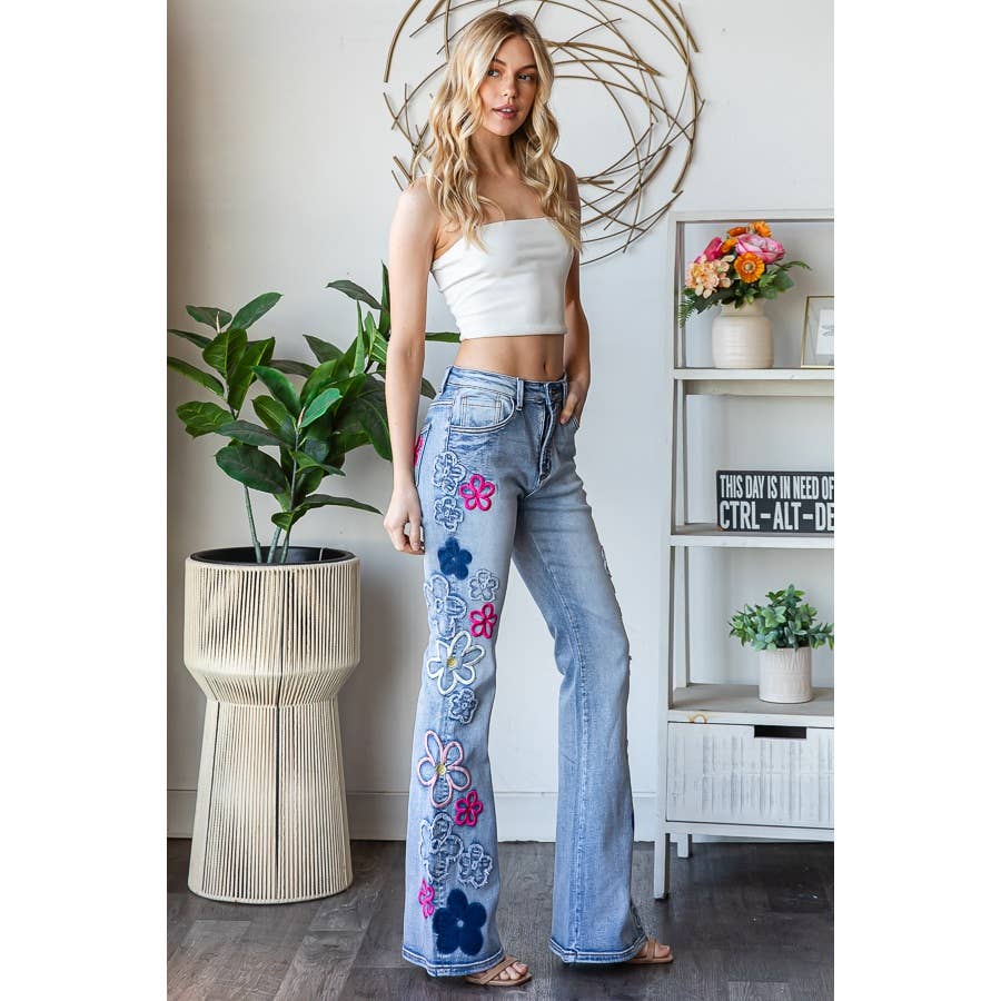 FLOWER EMBROIDERY DENIM PANTS - MINERAL WASH DETAIL
