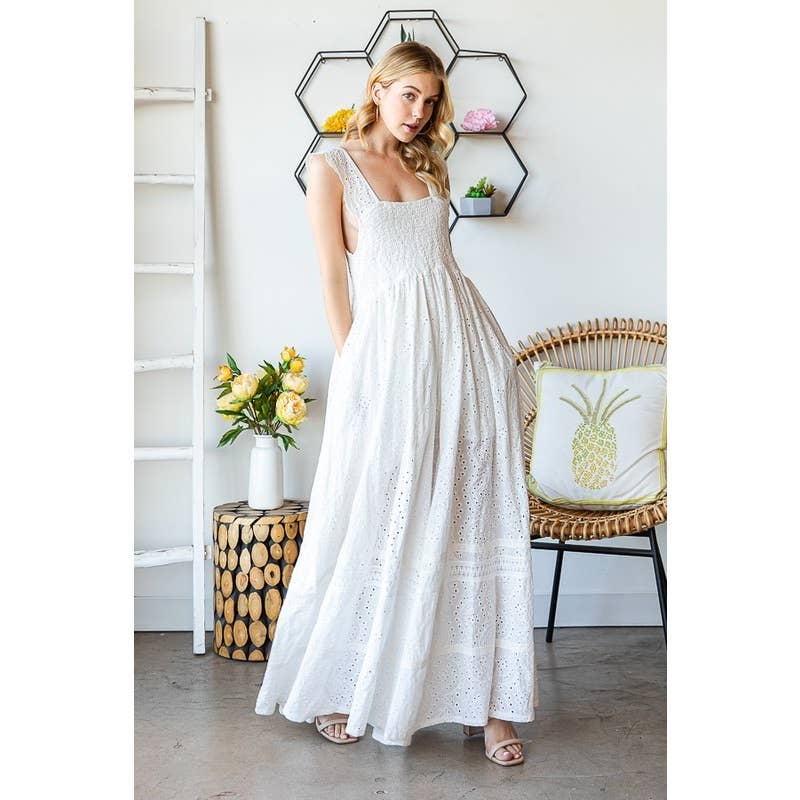 WHITE SMOCKED EYELET SLEEVELESS WIDE LEG JUMPSUIT