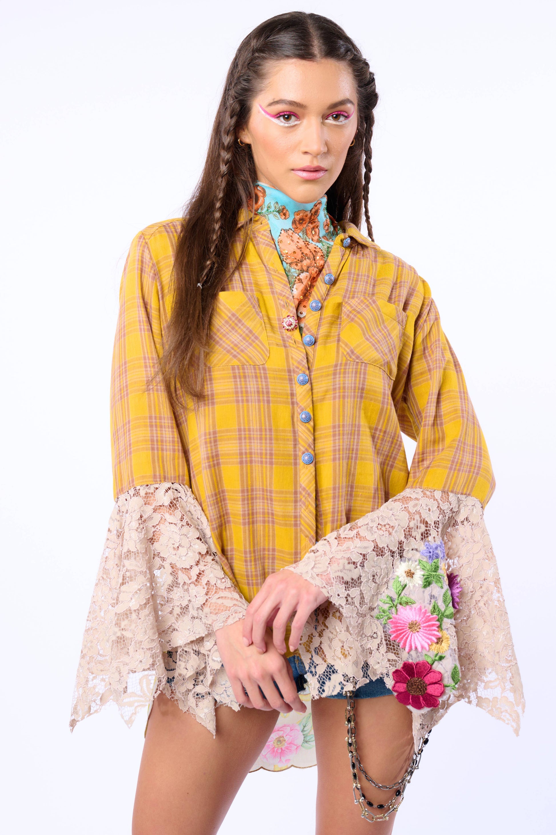 - Plaid shirt with dramatic lace ruffled sleeve detail